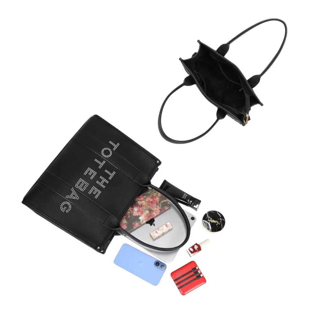 Un grand tote bag noir élégant et facile à assortir, relevé par les strass pour un côté glamour. Parfait comme sac de travail, de cours ou de ville pour celles qui veulent un sac spacieux sans renoncer au style.