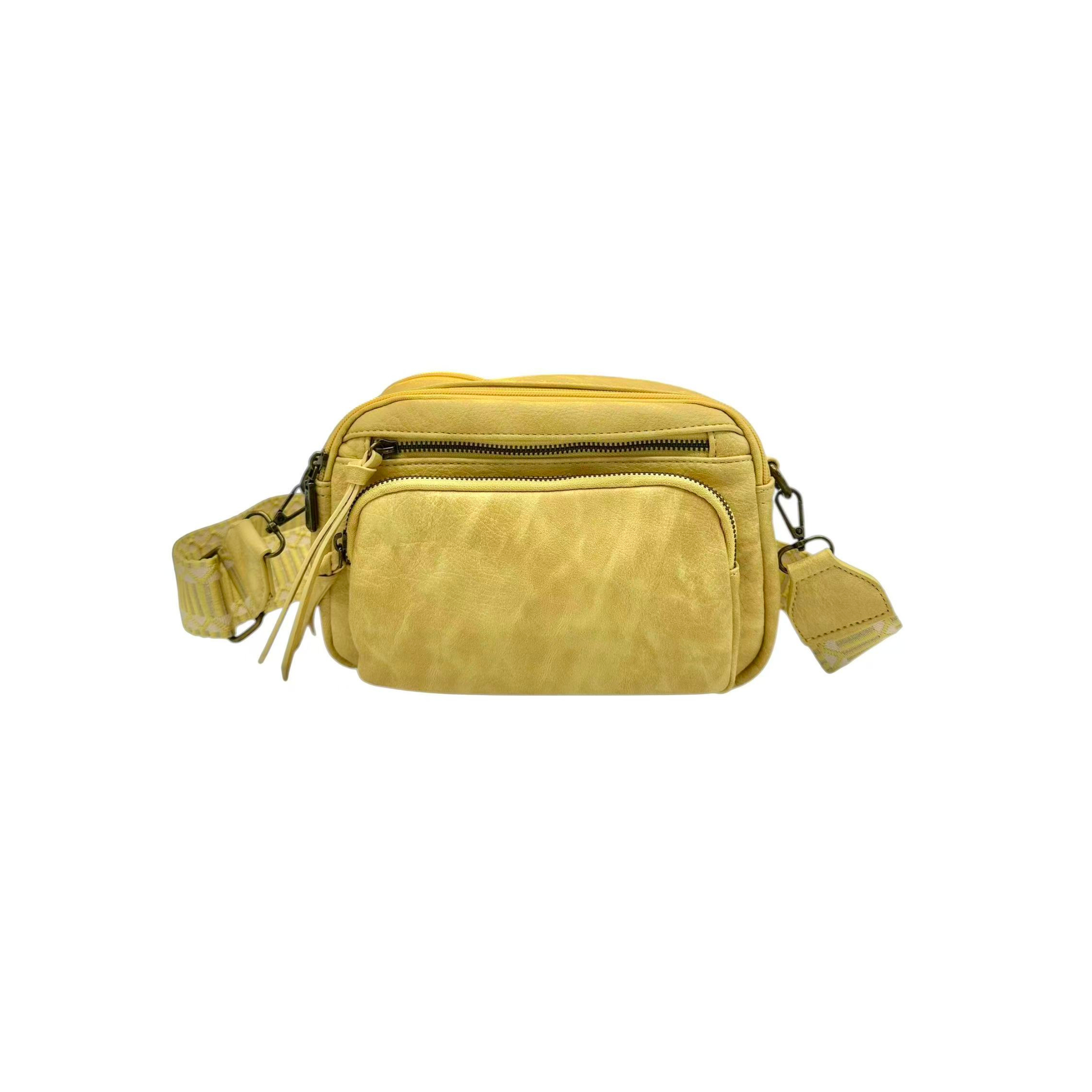 Sac bandoulière femme en matière synthétique jaune moutarde, pratique et tendance, équipé de deux bandoulières amovibles et réglables : une large en tissu et une fine. Idéal pour un usage quotidien avec style.