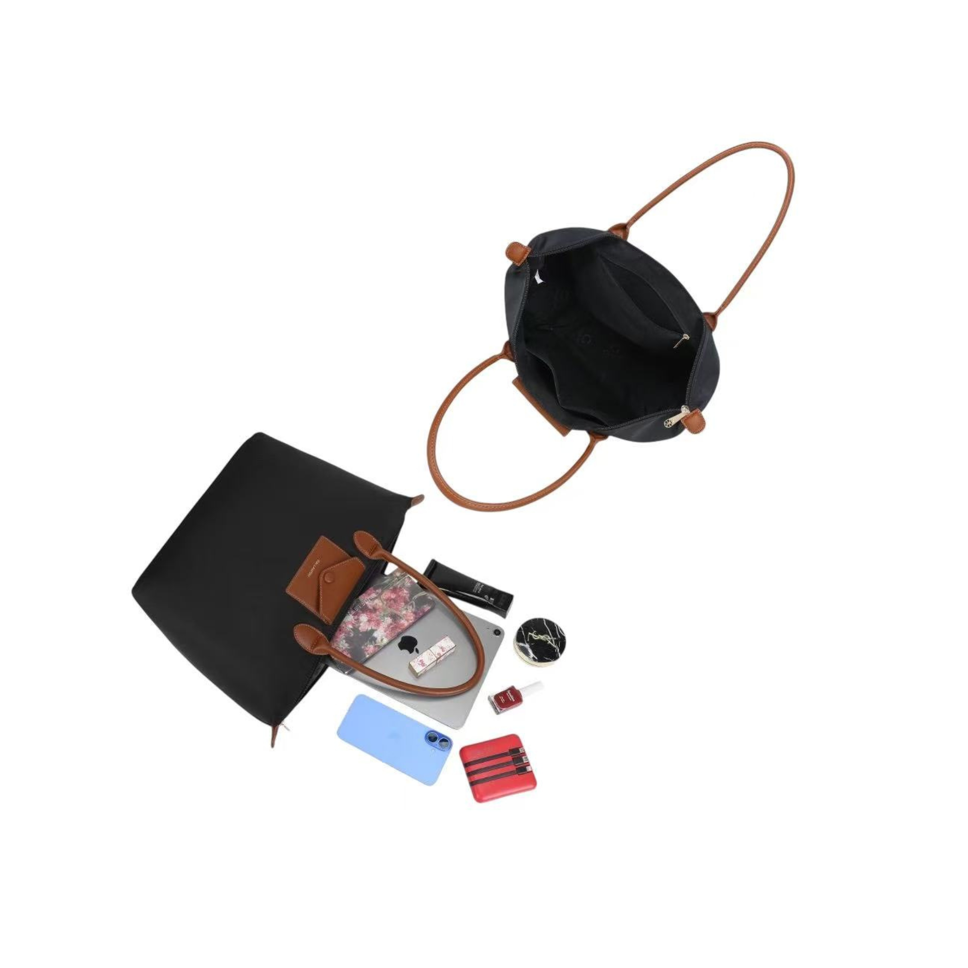 Associant élégance et fonctionnalité, ce cabas conjugue un noir profond avec des détails camel pour un style intemporel et raffiné.