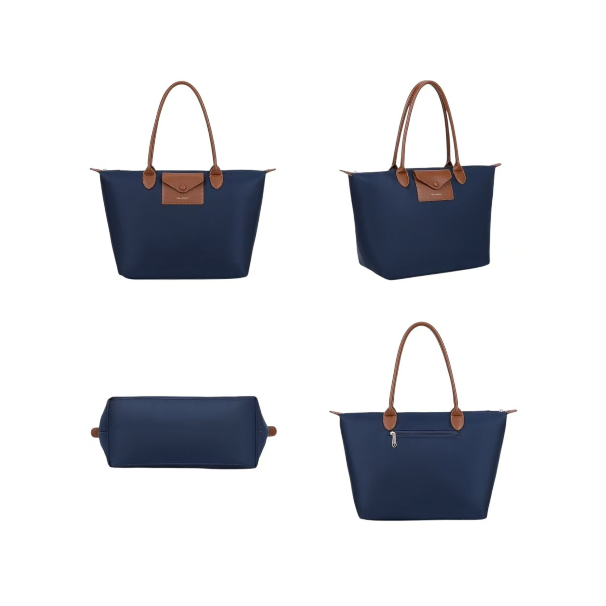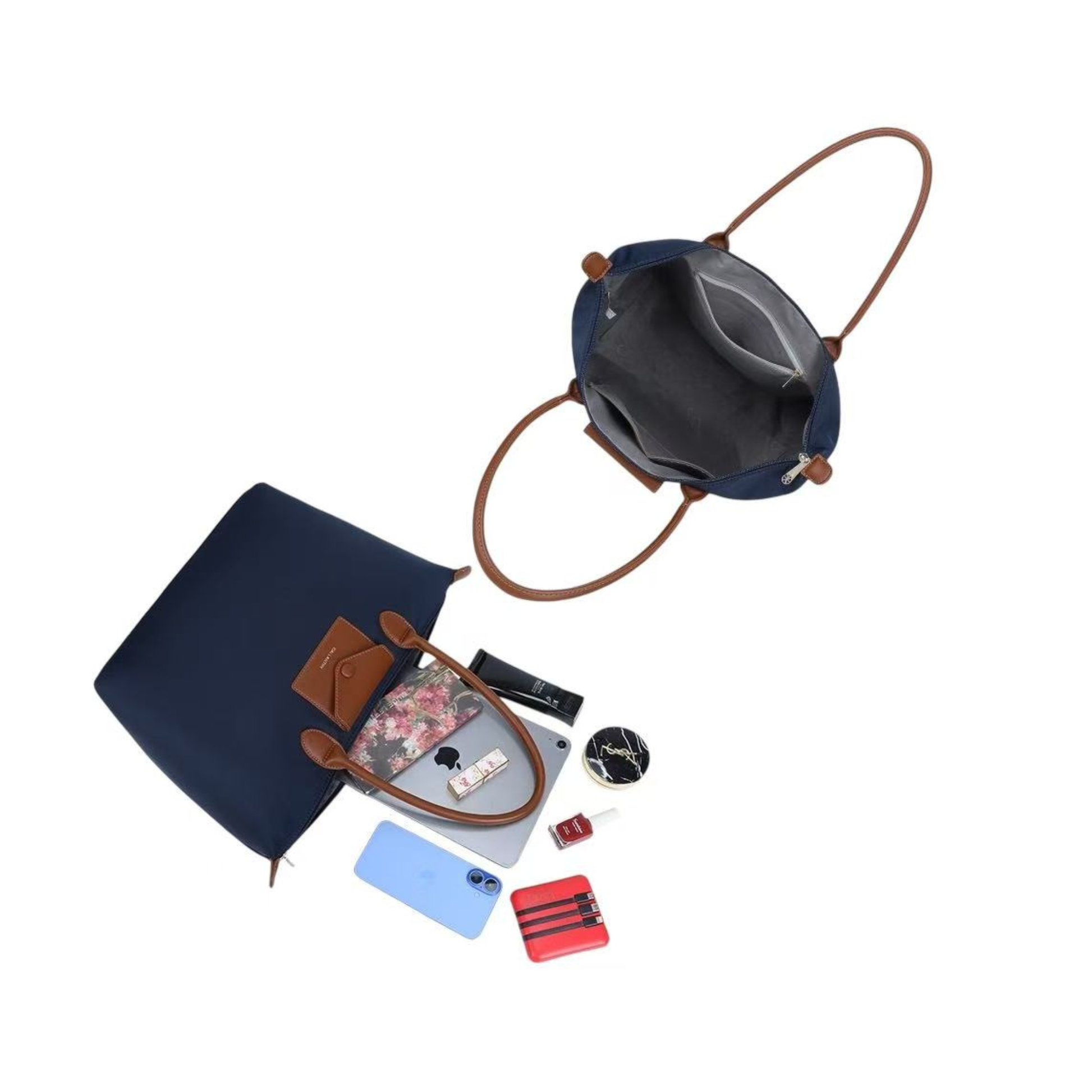 Associant élégance et fonctionnalité, ce cabas conjugue un bleu foncé profond avec des détails camel pour un style intemporel et raffiné.